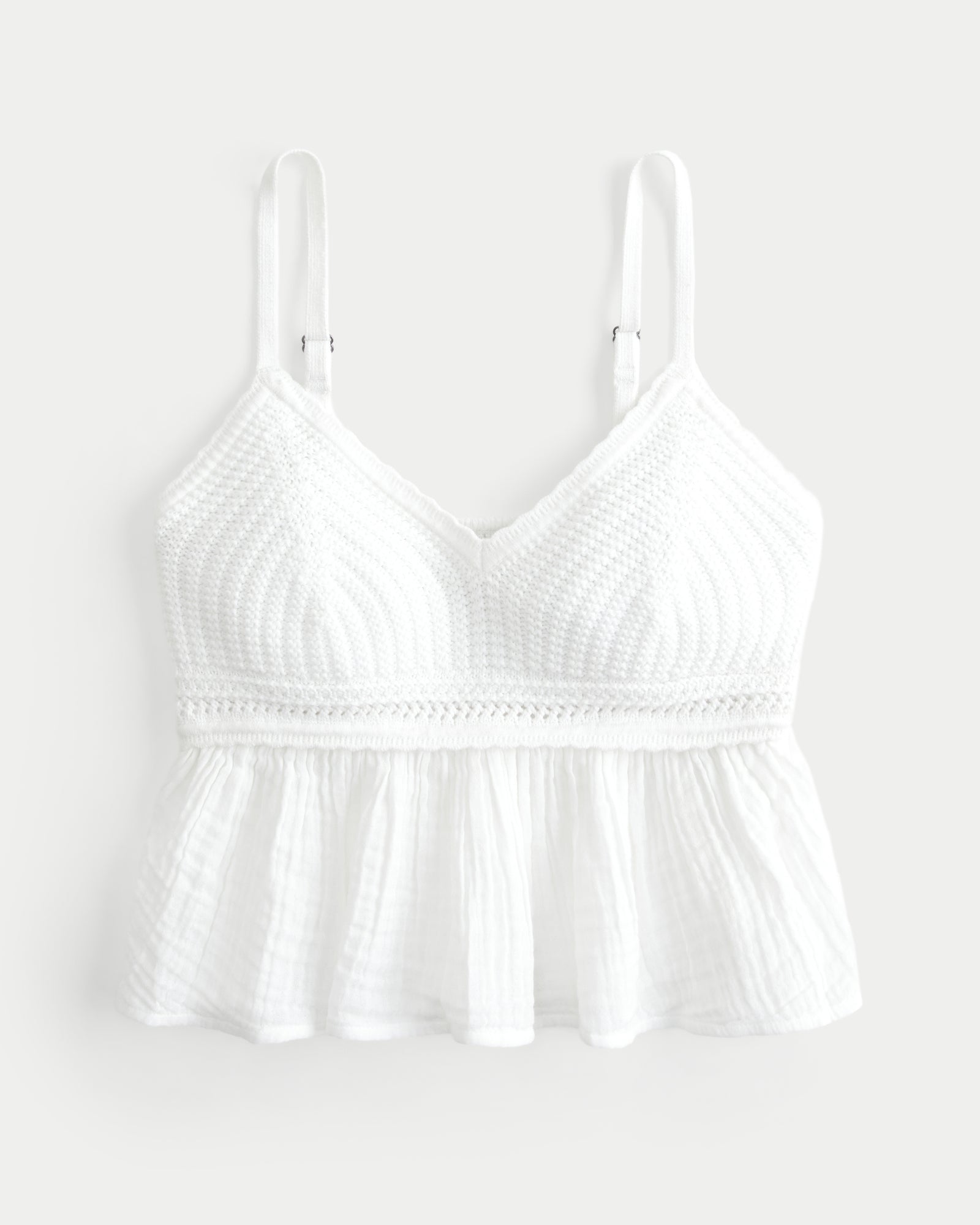 Indulge in unparalleled comfort and charm with this delightful top. Showcasing a delicate crochet-like pattern across the bust, it transitions seamlessly into a graceful, sheer hem. Featuring adjustable straps and a flattering V-neckline, this easy-to-wear piece is perfect for any occasion.