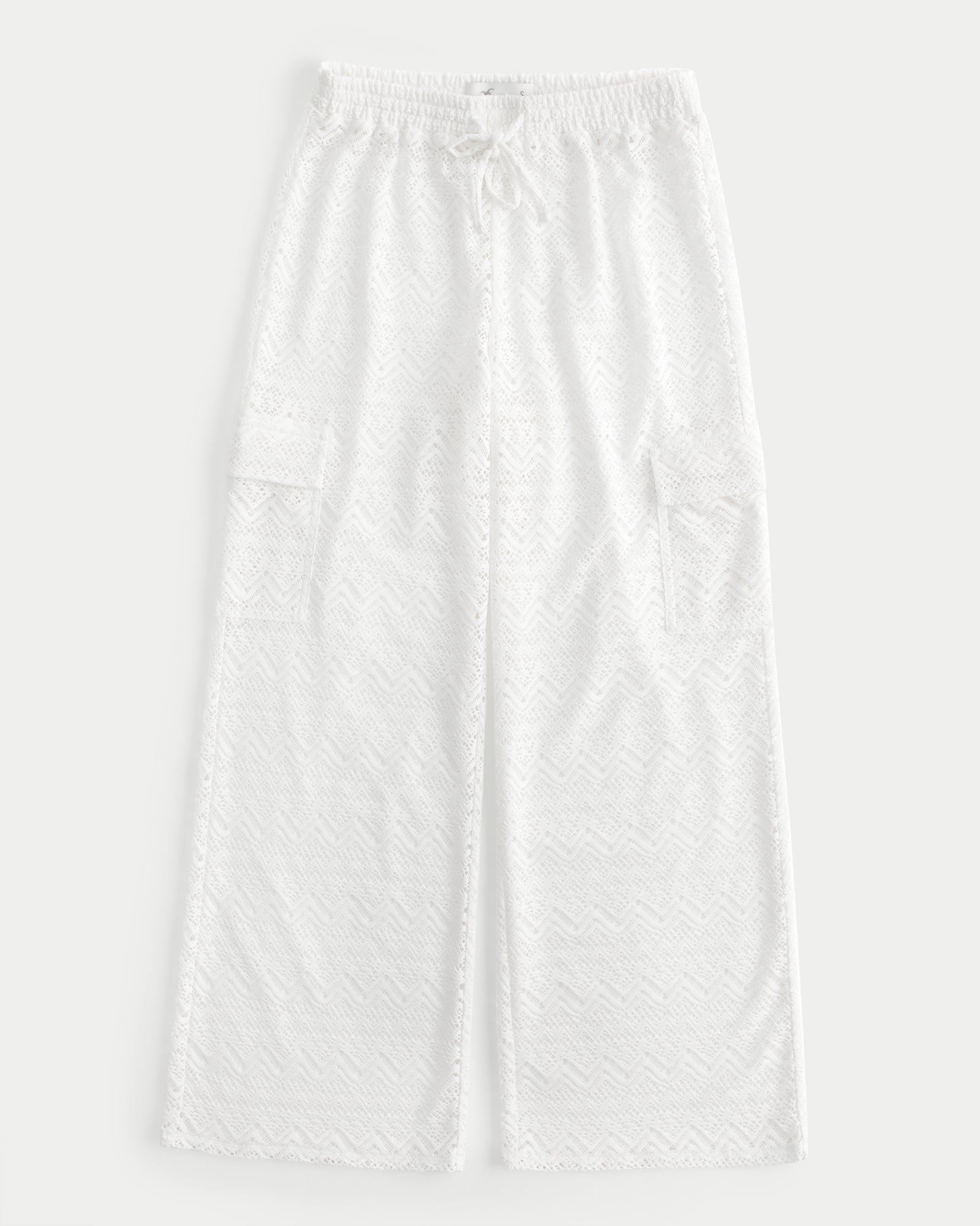 These effortlessly chic pants feature a flowing wide-leg silhouette and delicate lace pattern. Crafted from a soft, comfortable fabric, they include a relaxed drawstring waist and convenient side pockets.