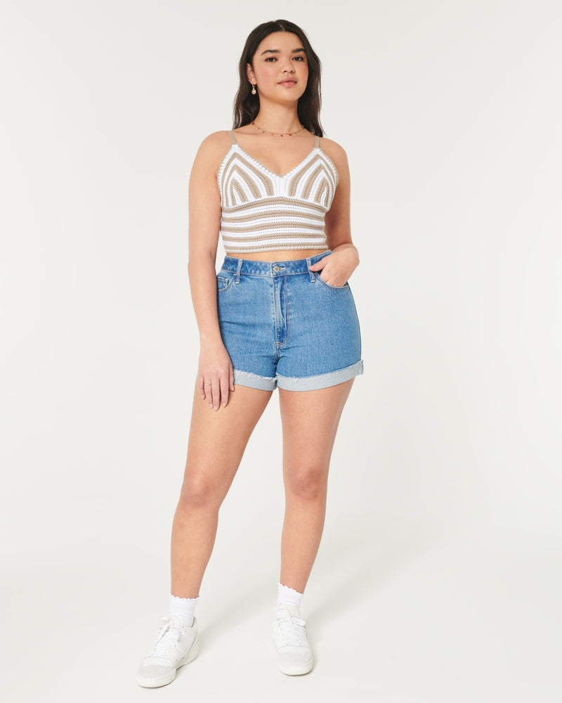 A soft bralette made from comfy crochet-style fabric, with built-in lining for comfort and support. Features adjustable straps, cropped length, and v-neckline. Slim fit.
